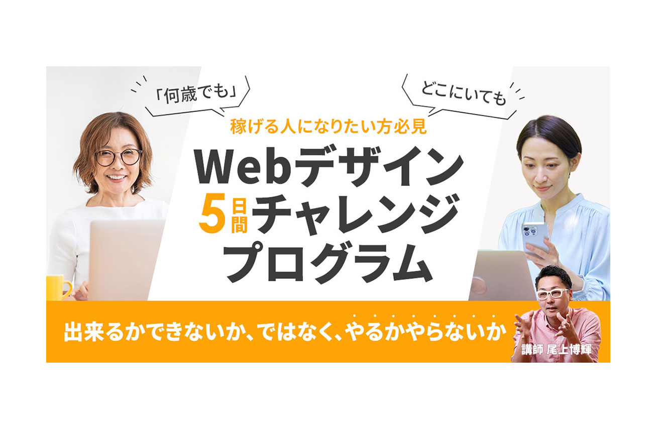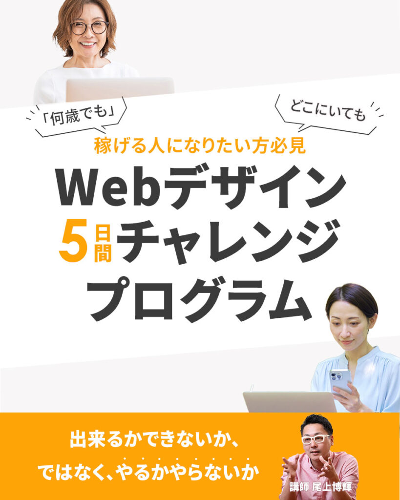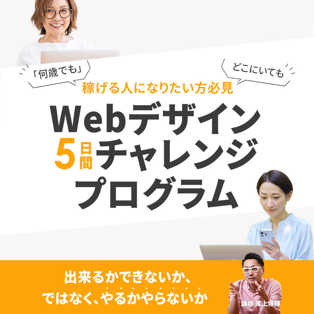 ■元気の出るカラーのオレンジを使用しています。ターゲットである20~60代の男女万人にチャレンジしていただきたく使用しました。"5日間チャレンジプログラム”の「5日間」をオレンジをポイントにしましたのは、ポイントカラーを置くことで読み離脱をなくす意図があります。2人の女性の写真を配置したのは、「何歳でも」「どこでも」をより視覚的に伝え、私もチャレンジしてみよう!とターゲットにアピールするために使用しています。